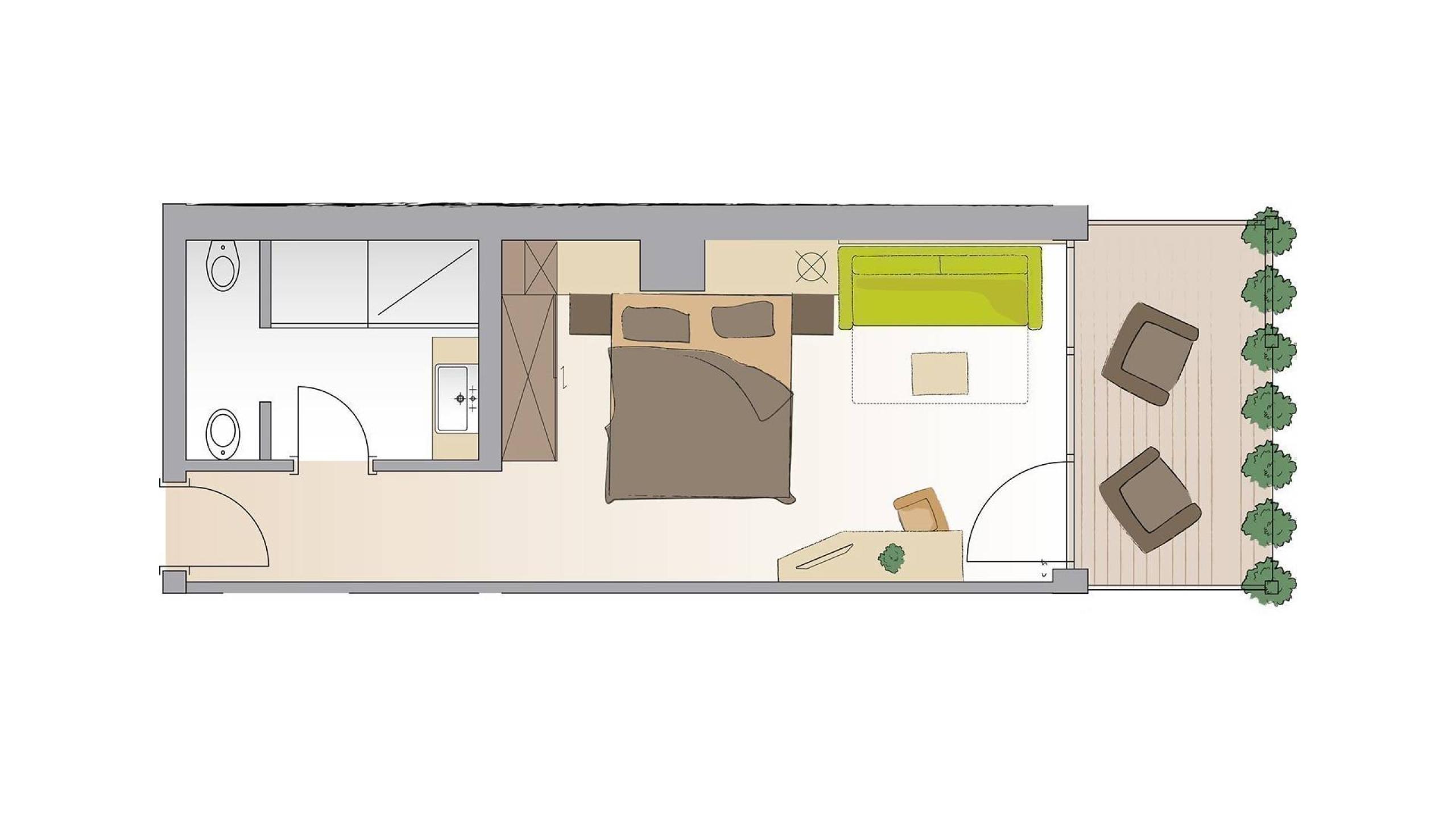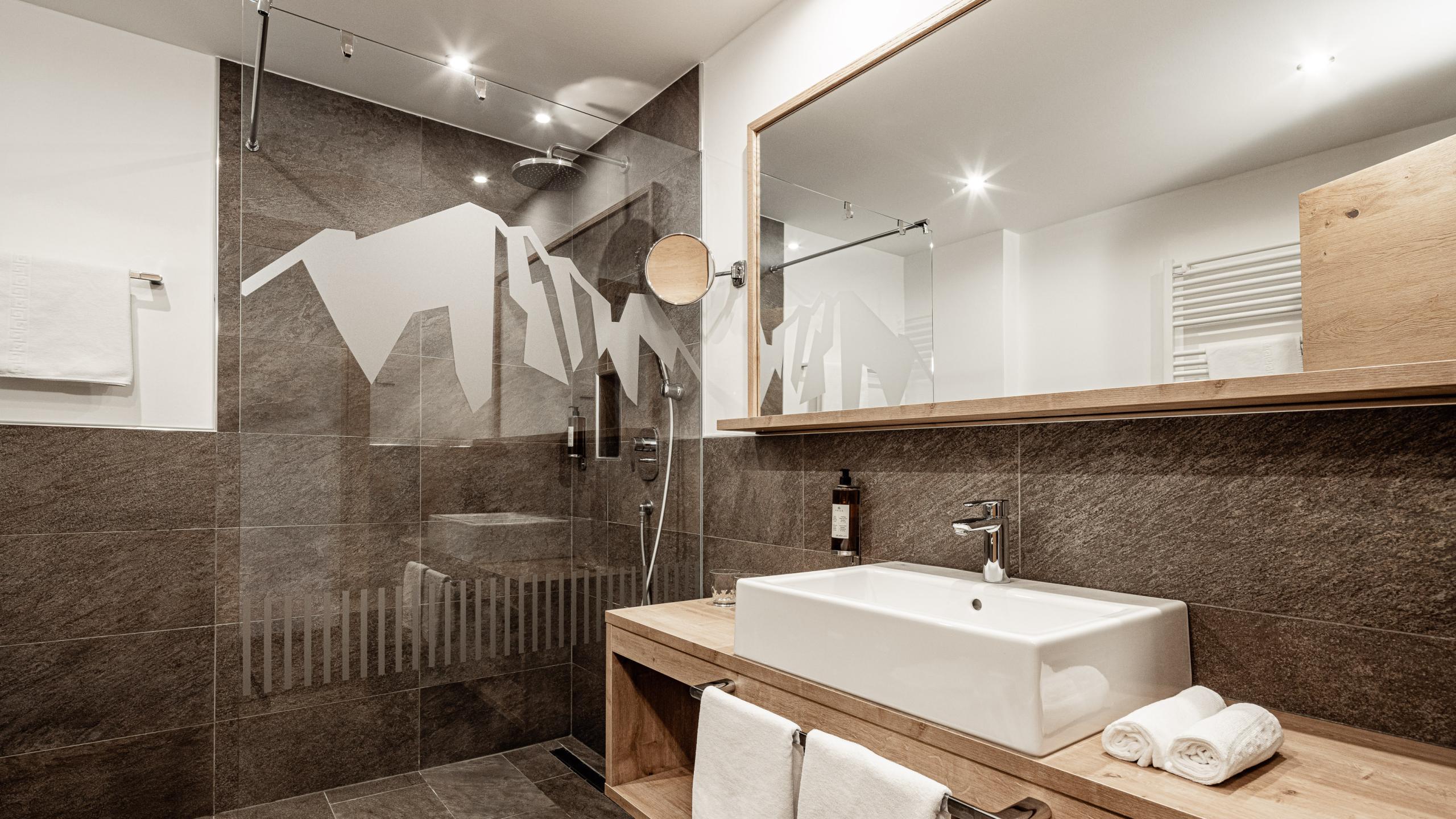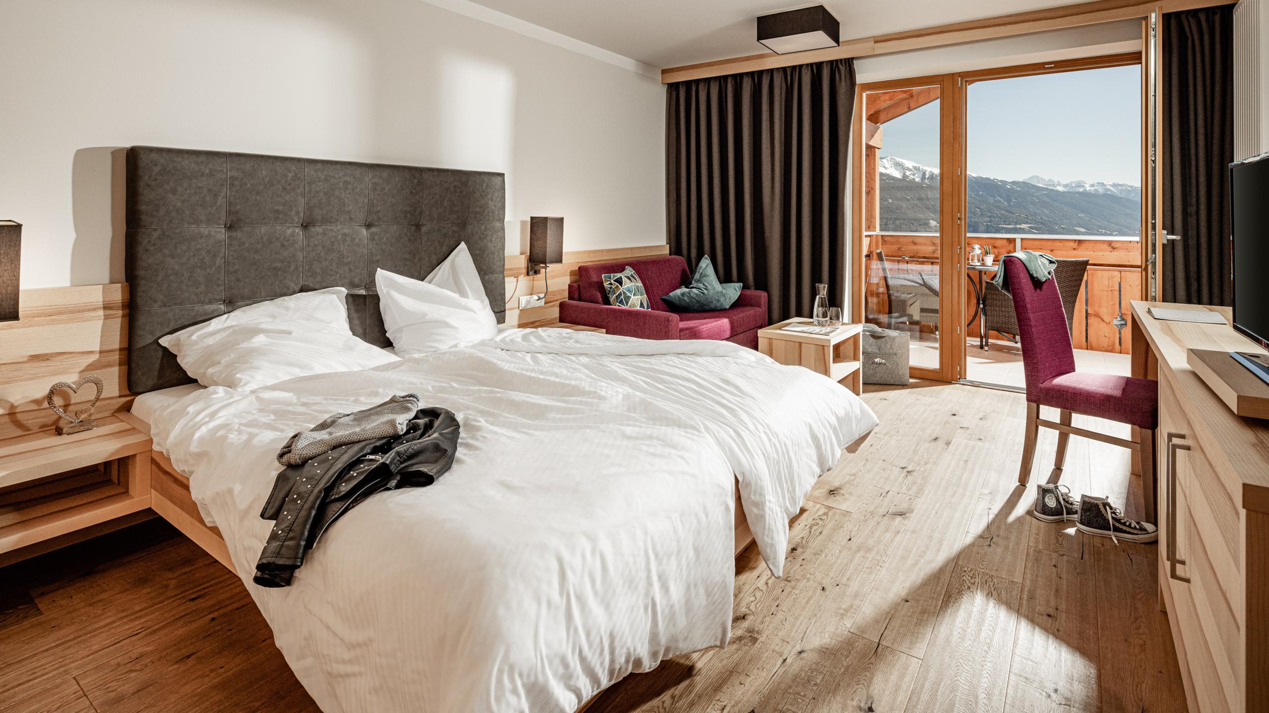 The Valley View Deluxe rooms are on the first, second, and third floor on the south side of the hotel. They have wooden floors in aspen oak, a comfortable double bed, ash furnishings, sitting area, bathroom with toilet, shower, bidet, make-up mirror, and underfloor heating, balcony with cosy sitting area and views of Valle Isarco/Eisacktal, Val Pusteria/Pustertal, and the Dolomites, as well as a flat-screen satellite TV, telephone, safe, and mini fridge.